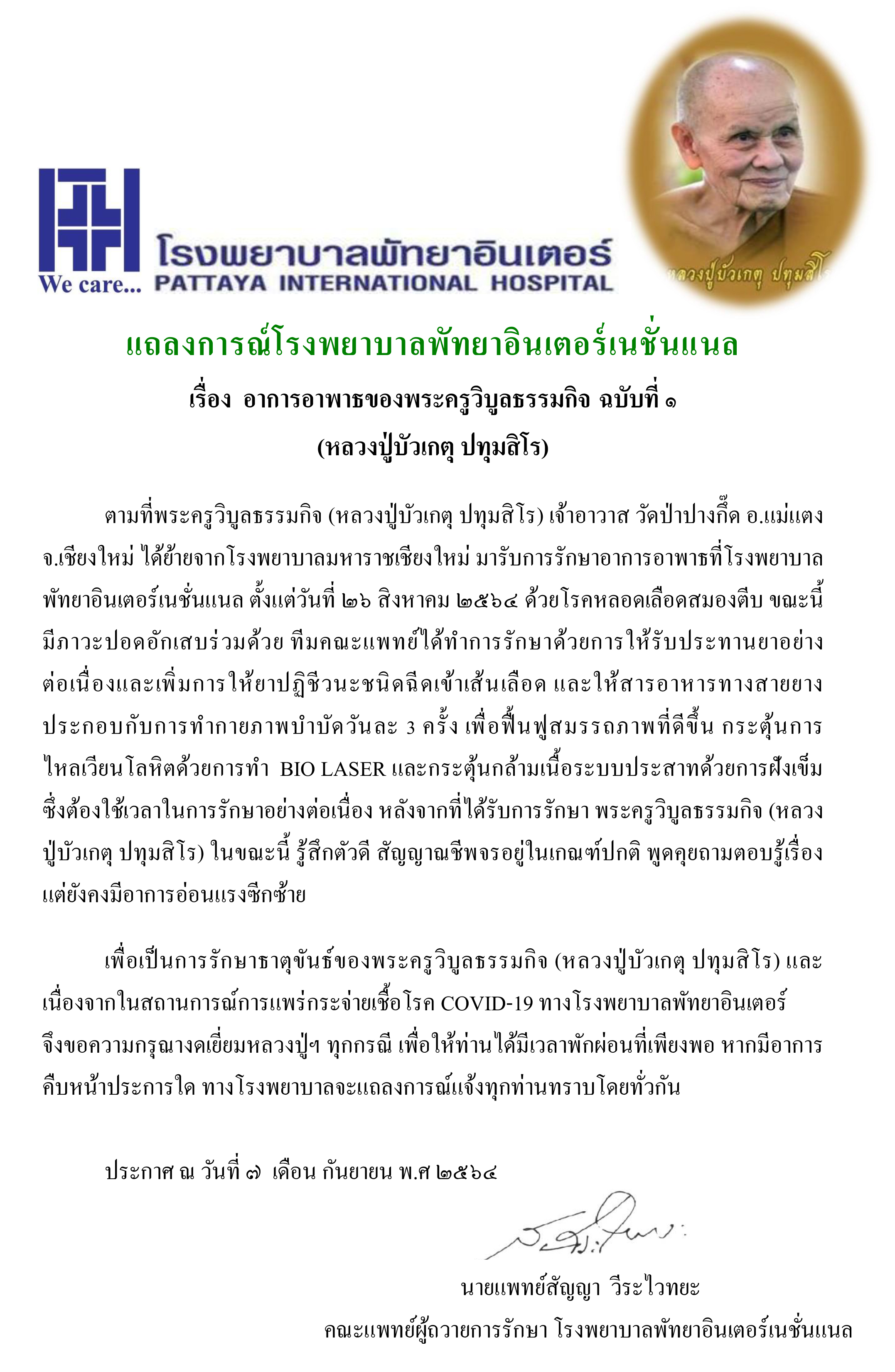แถลงการณ์โรงพยาบาลพัทยาอินเตอร์เนชั่นแนล อาการอาพาธของพระครูวิบูลธรรมกิจ ฉบับที่ ๑ (หลวงปู่บัวเกตุ ปทุมสิโร)